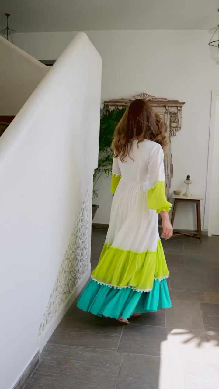 Add a refreshing splash of color to your wardrobe with the Abhivani Lime Breeze Tiered Maxi Dress. Designed with a soft ivory base and vibrant lime green and aqua blue tiers, this dress brings together elegance and playful charm in the most effortless way.